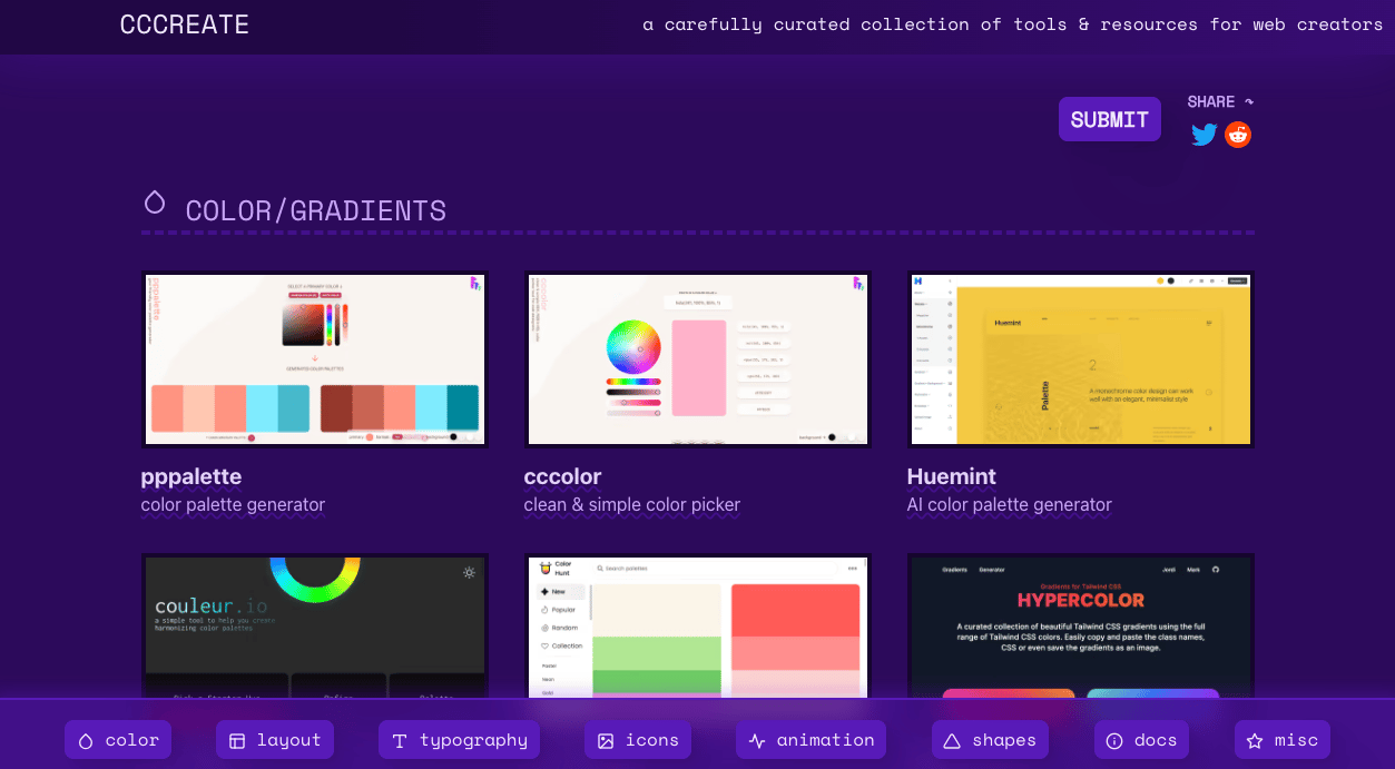 A collection of useful online tools, including free resources for colors, layouts, icons, animations, patterns, and more.
